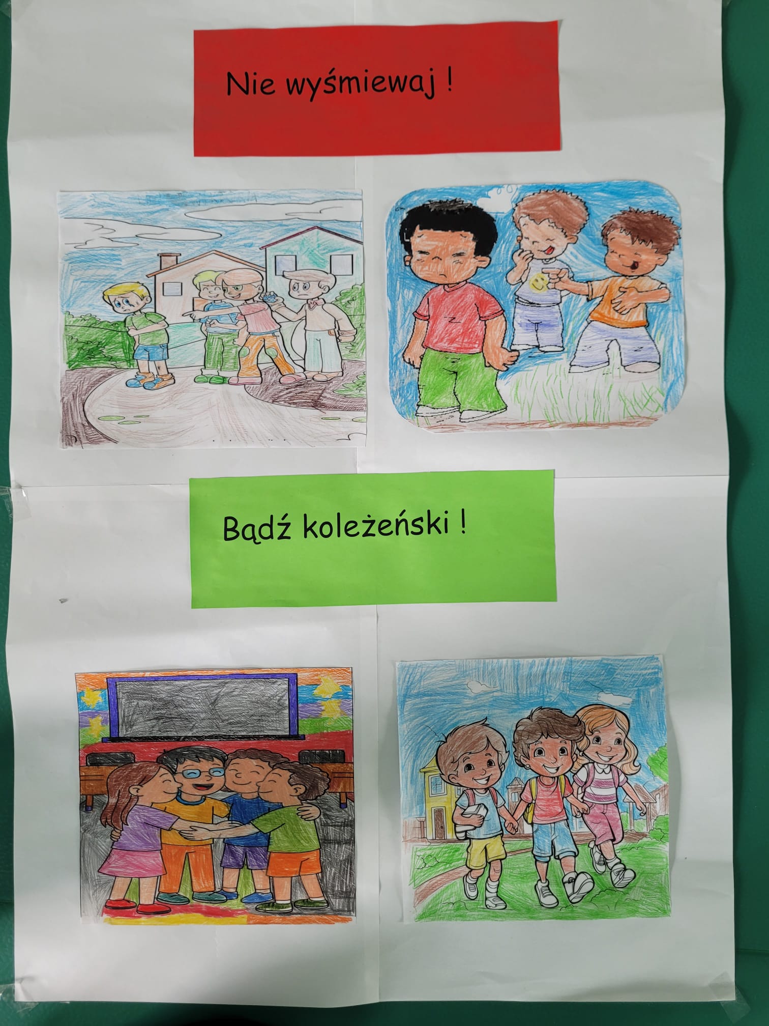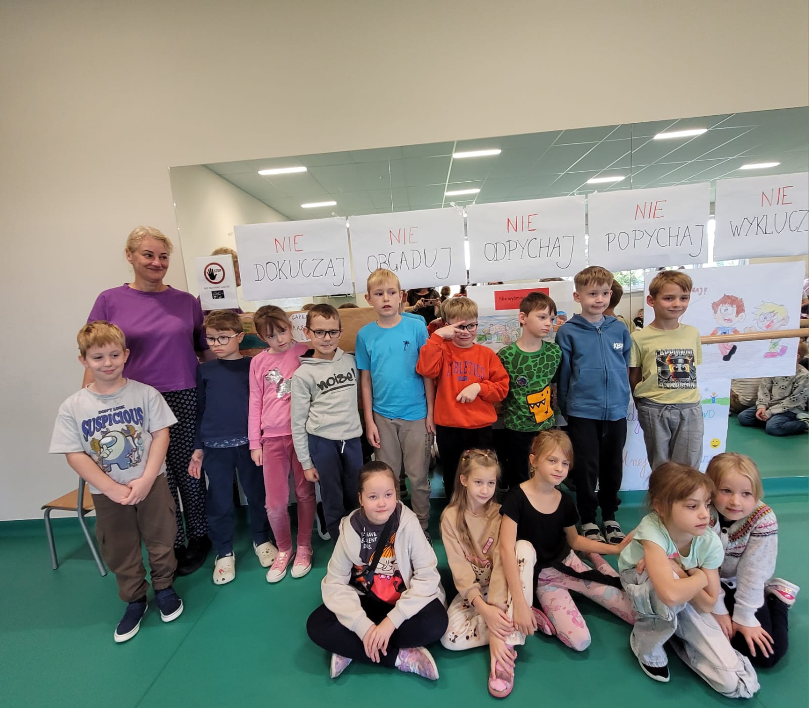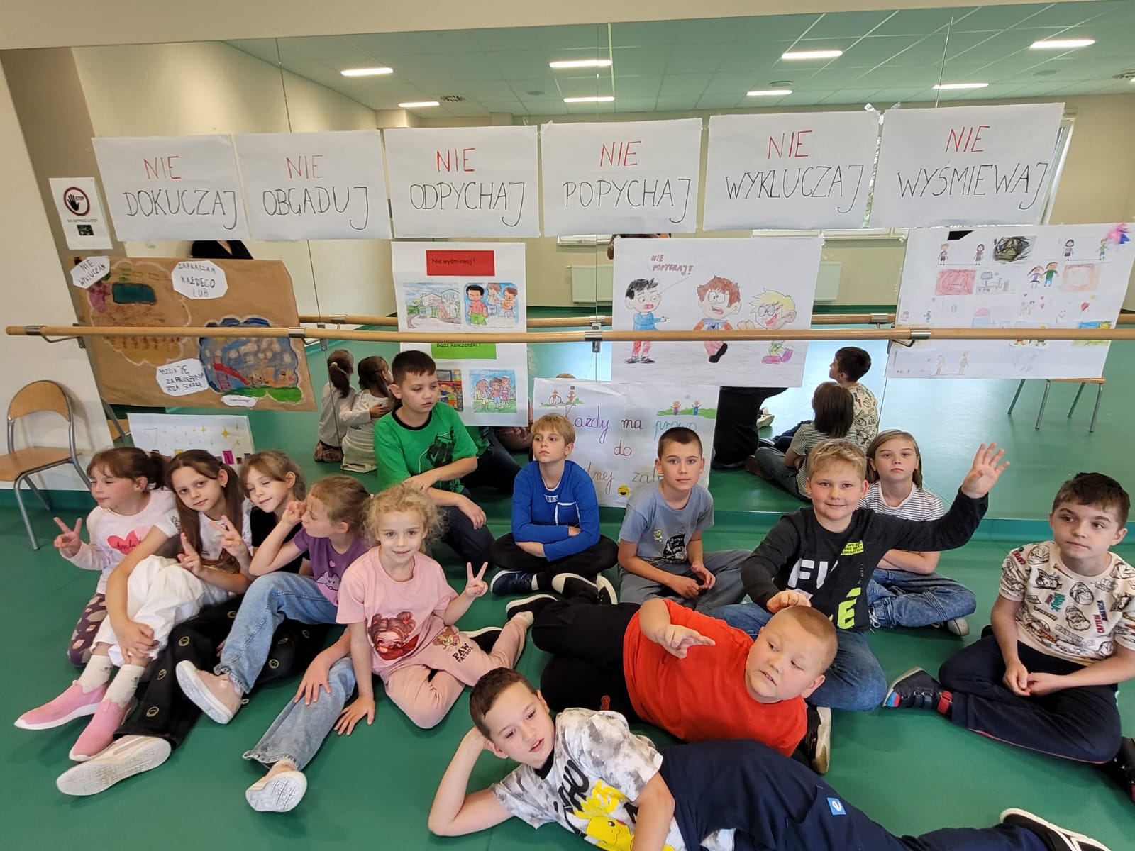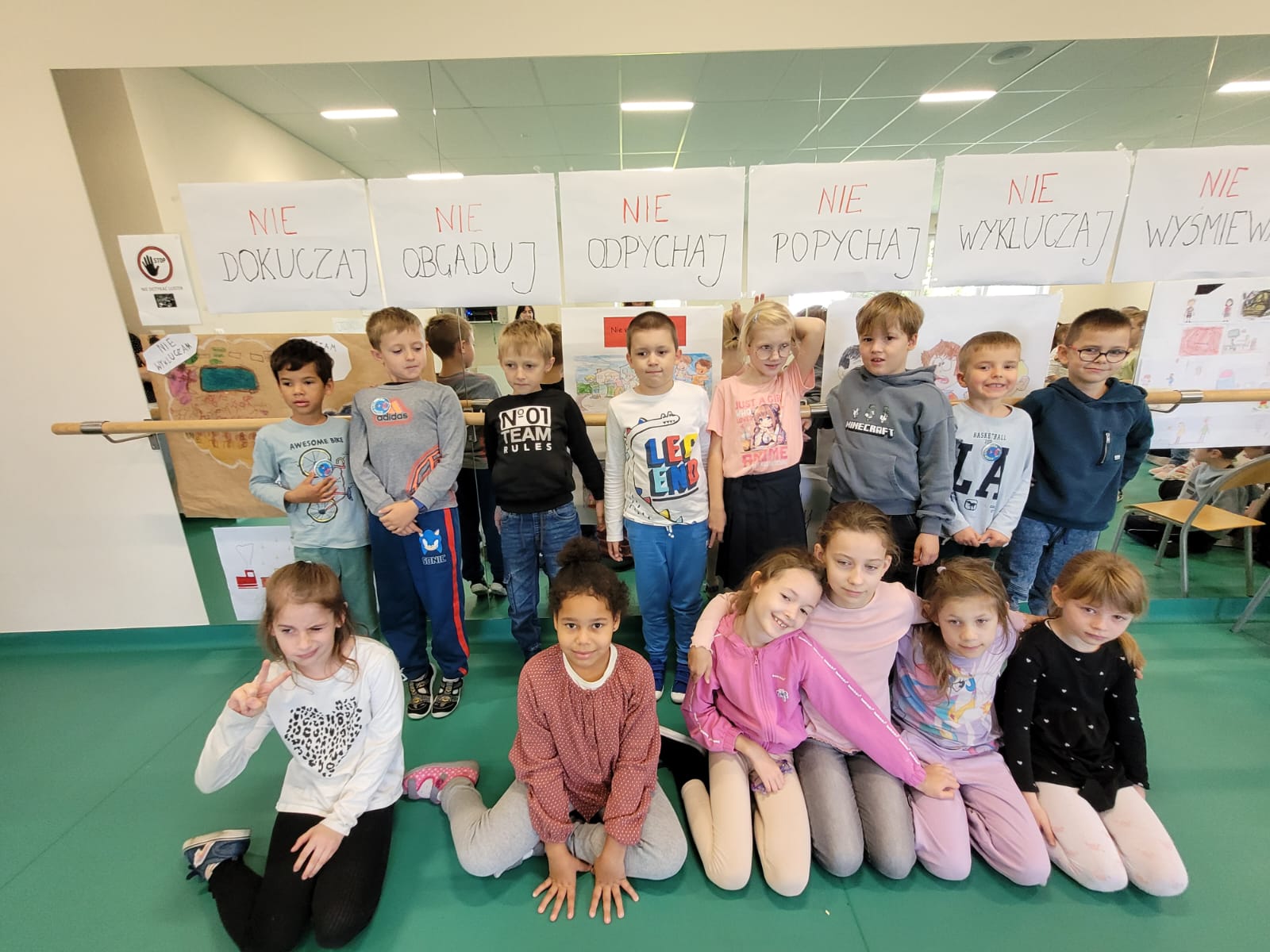 Wszystkie klasy wraz z wychowawcami przygotowały przepiękne plakaty i scenki mówiące o przemocy rówieśniczej: NIE DOKUCZAJ, NIE WYKLUCZAJ, NIE POPYCHAJ, NIE WYŚMIEWAJ.