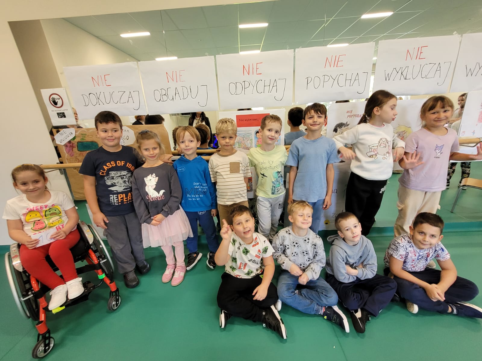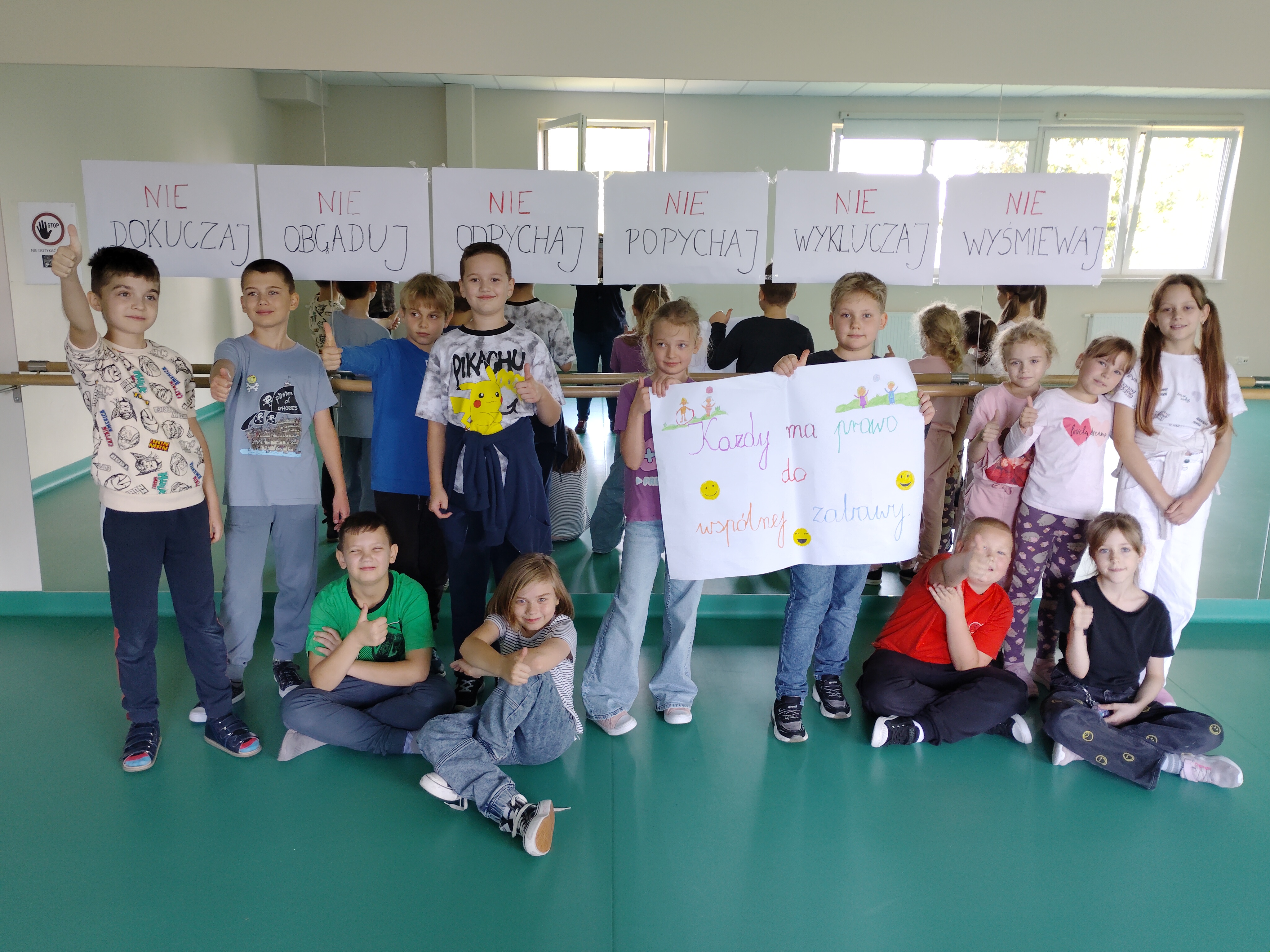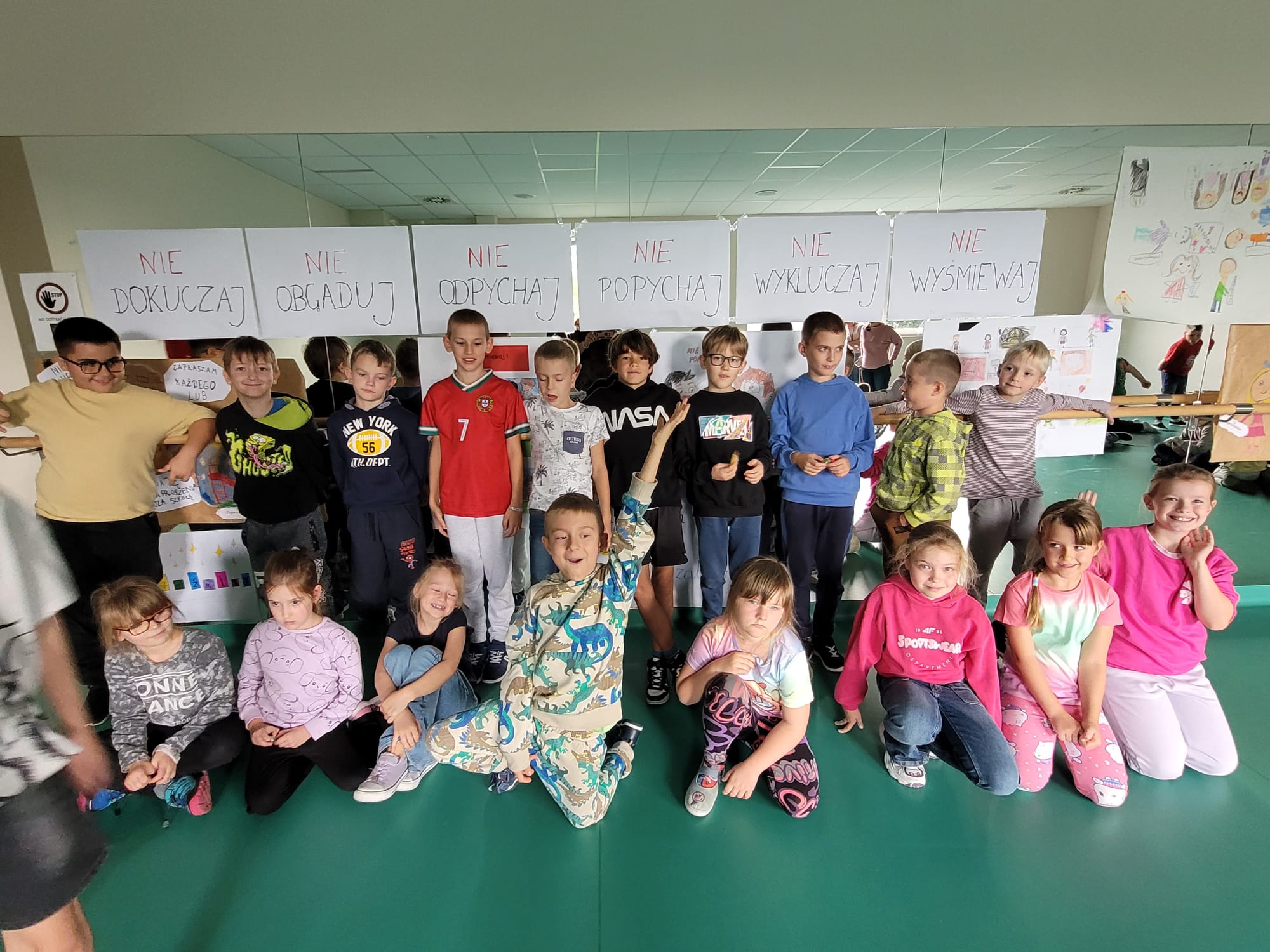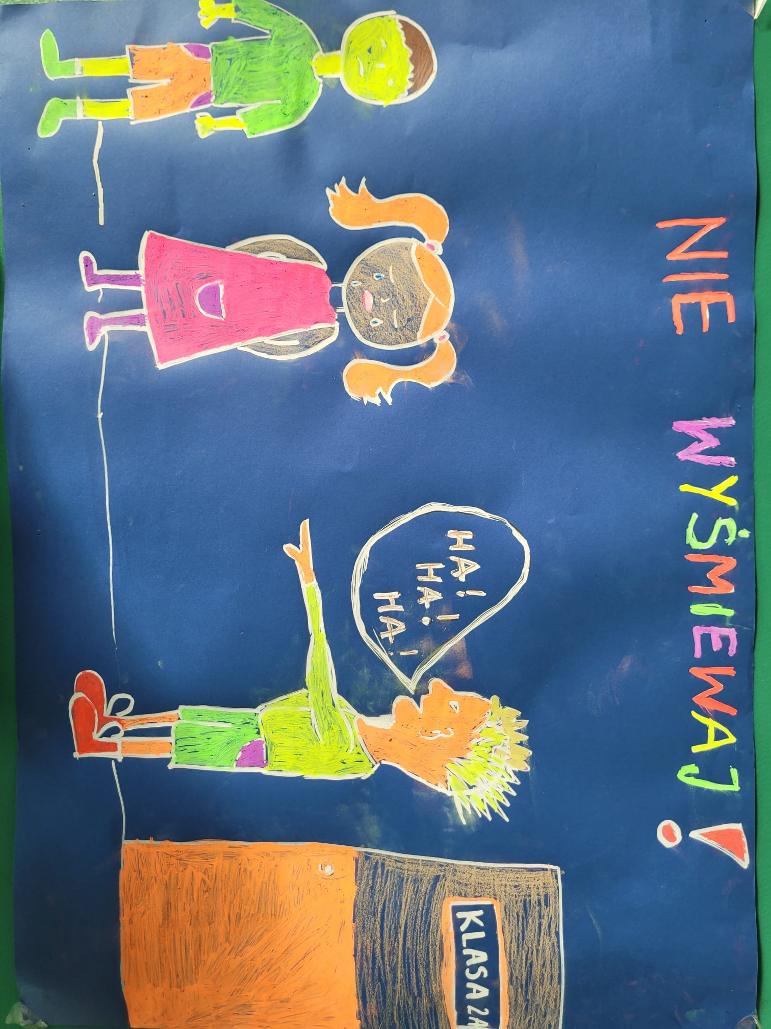 Wszystkie klasy wraz z wychowawcami przygotowały przepiękne plakaty i scenki mówiące o przemocy rówieśniczej: NIE DOKUCZAJ, NIE WYKLUCZAJ, NIE POPYCHAJ, NIE WYŚMIEWAJ.