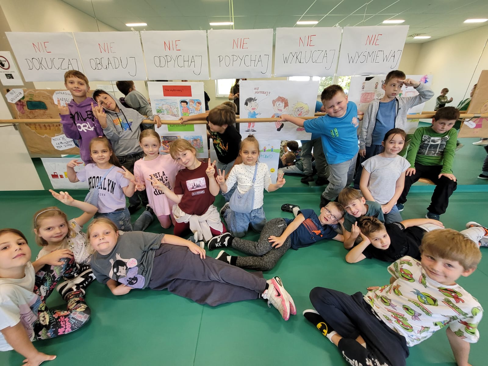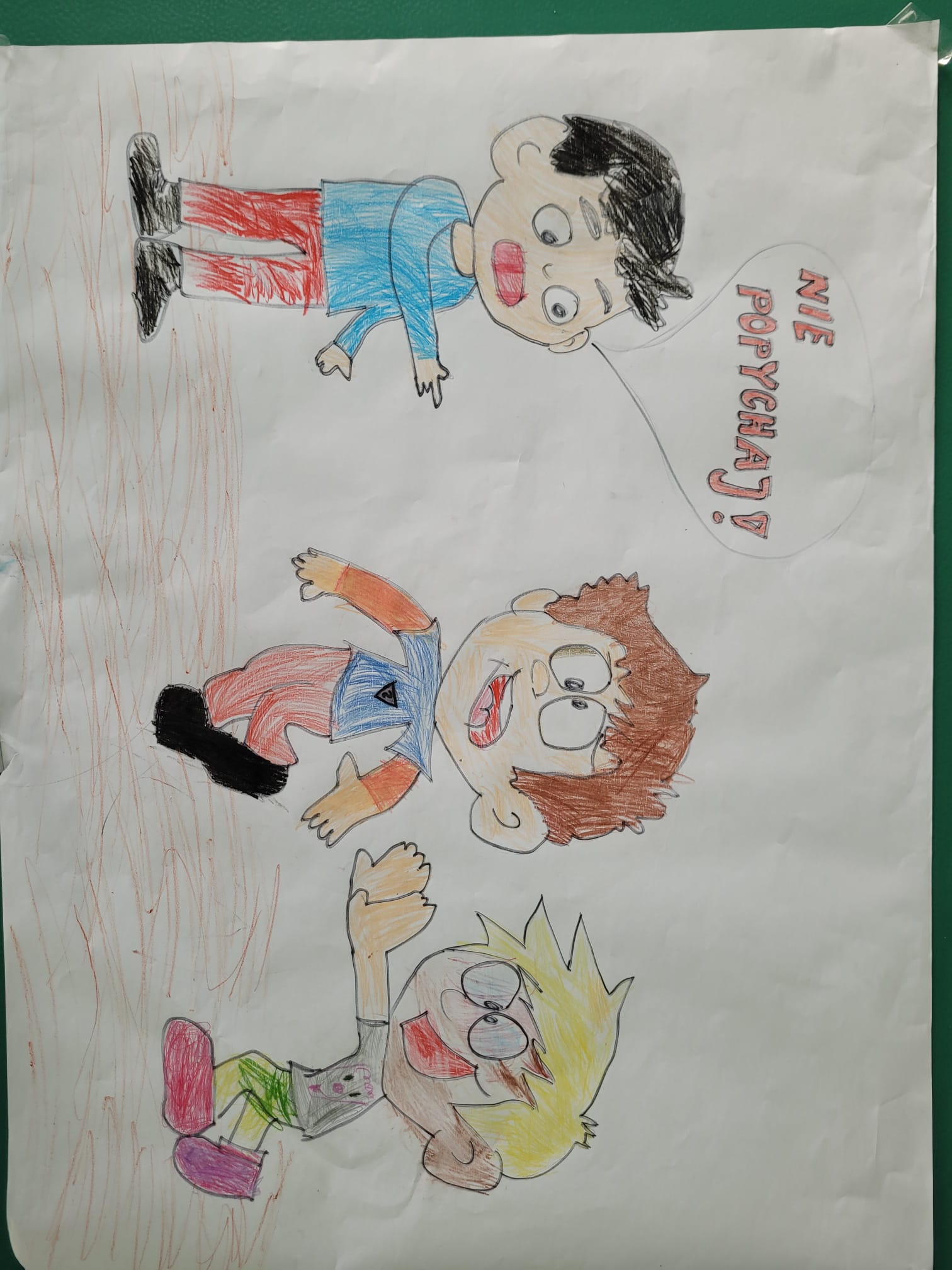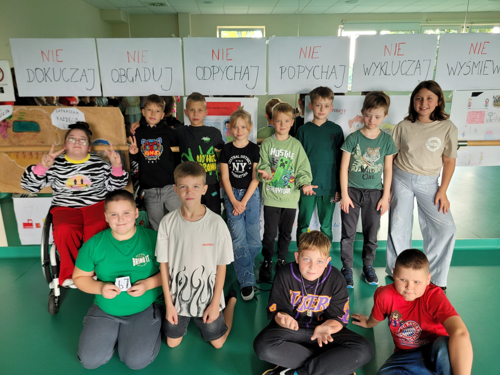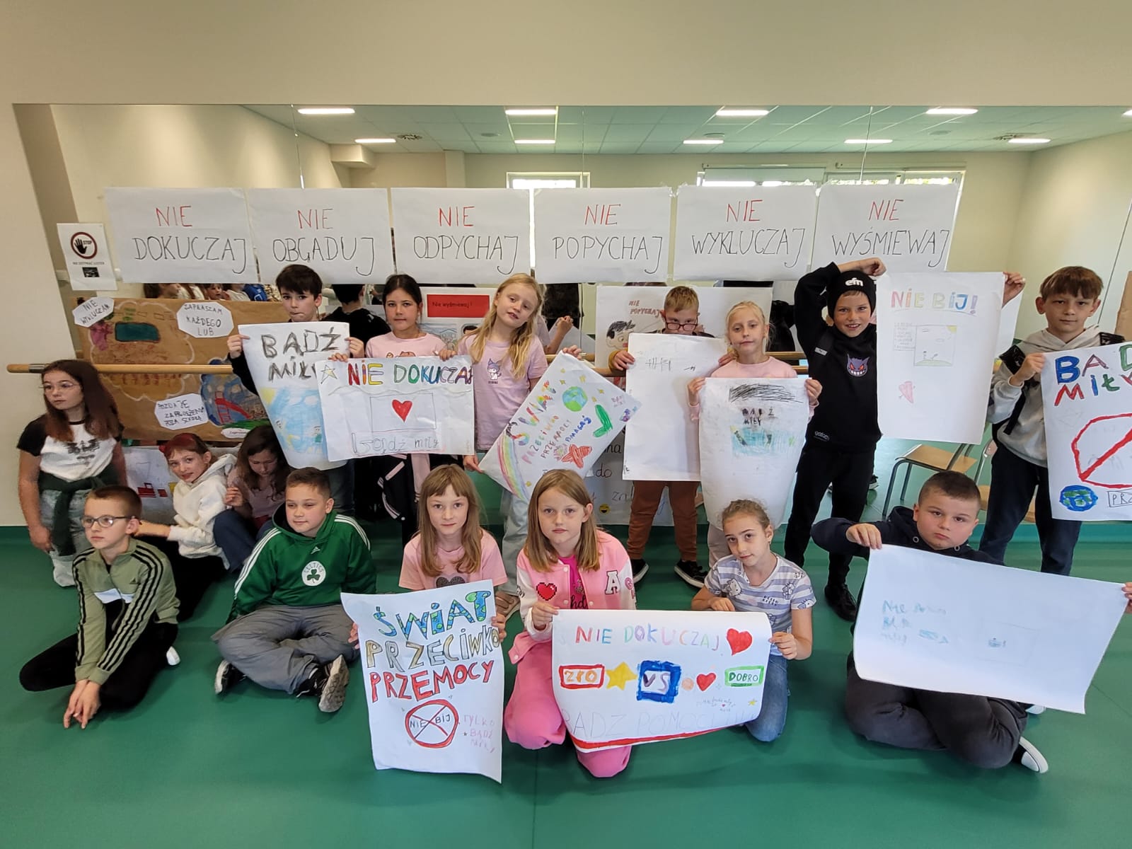 Wszystkie klasy wraz z wychowawcami przygotowały przepiękne plakaty i scenki mówiące o przemocy rówieśniczej: NIE DOKUCZAJ, NIE WYKLUCZAJ, NIE POPYCHAJ, NIE WYŚMIEWAJ.