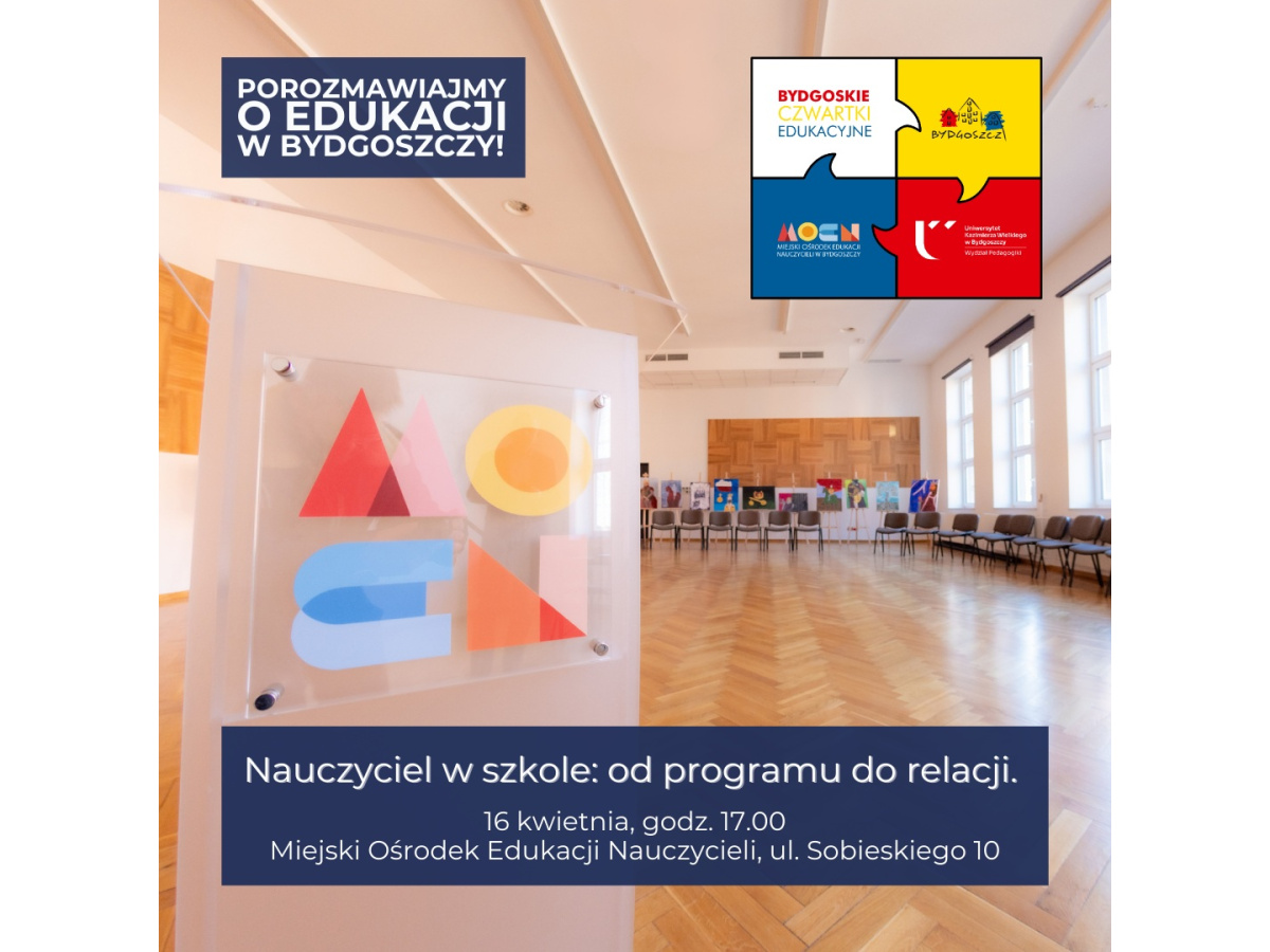 Zapraszamy 16 kwietnia od godz. 17.00 do auli Miejskiego Ośrodka Edukacji Nauczycieli w Bydgoszczy, ul. Jana III Sobieskiego 10 na wyjątkowe spotkanie pn. „Nauczyciel w szkole: od programu do relacji”,