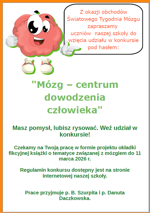 Serdecznie zapraszamy do udziału w konkursie szkolnym pt. „Mózg – centrum dowodzenia człowieka”, który skierowany jest dla uczniów klas IV-VIII oraz klas I-III. Zadaniem konkursowym jest wykonanie projektu okładki książki o tematyce związanej z mózgiem.